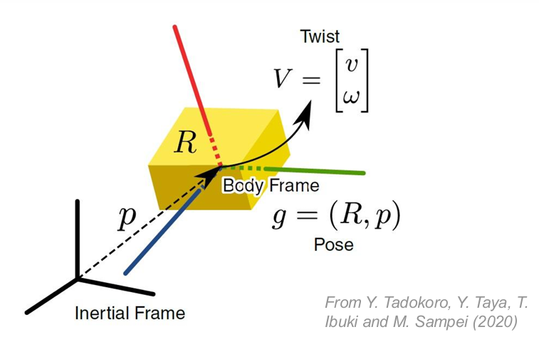- 位姿 $ g = (R, p) $:刚体相对于惯性系的位置与姿态。